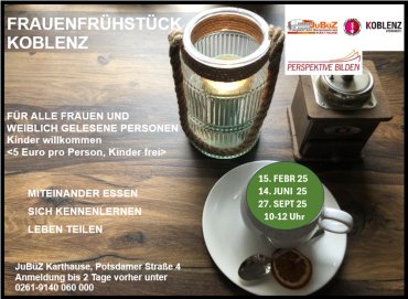 Für einen Kostenbeitrag von 5 Euro pro Teilnehmerin (Kinder frei) erwartet Sie ein kleines, leckeres Frühstück, das zum Verweilen und Genießen einlädt. Zur besseren Planung bitten wir um eine kurze Anmeldung: JuBüZ Tel.: 0261/9140 060 000 oder jubuez@stadt.koblenz.de, Anmeldeschluss ist der vorletzte Tag vor dem Frühstückstermin: 12. Juni 2025.