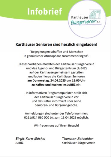 Viele ältere Menschen wünschen sich Zugang zur digitalen Welt. Ein Teil von ihnen nutzt regelmäßig PC oder Smartphone. Ein anderer Teil wünscht sich Unterstützung bei den aufkommenden Fragen und Herausforderungen. An diesem Punkt setzen die Digitalbotschafter des Landes Rheinland-Pfalz an. In den letzten fünf Jahren wurden flächendeckend ehrenamtlich tätige Seniorinnen und Senioren ausgebildet. Diese haben es sich zur Aufgabe gemacht anderen Senioren Hilfestellungen in der digitalen Welt anzubieten. Für die Karthause sind das, neben anderen Aktiven, Edgar Kühlenthal und Ingo Neumann. Für das Angebot im JuBüZ ist die mögliche Gruppengröße erreicht.